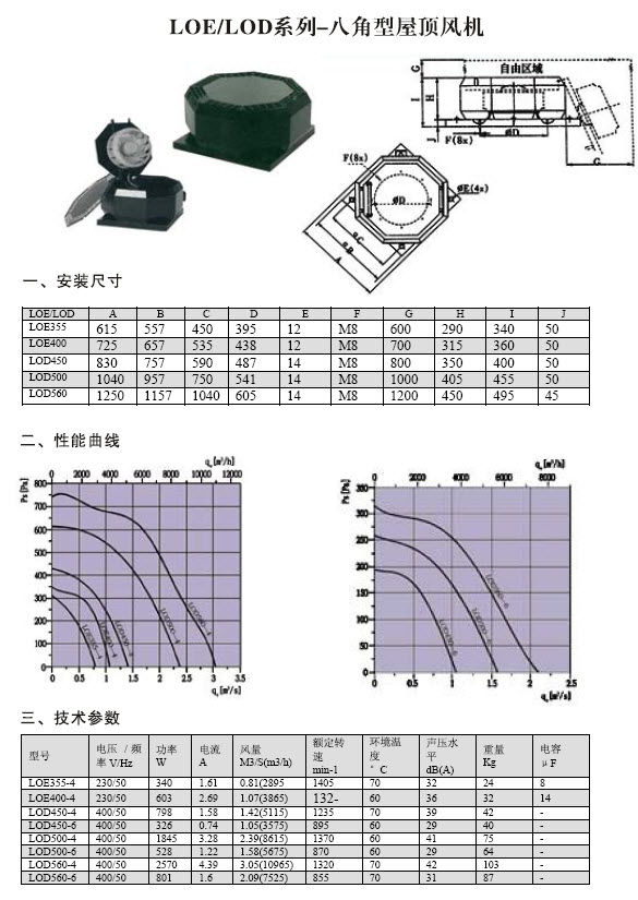 LOE/LOD系列八角型屋頂風(fēng)機(jī)是本系列風(fēng)機(jī)具有規(guī)格形式多、應(yīng)用范圍廣、效率高、噪聲低、質(zhì)輕、高強(qiáng)度、耐腐蝕、運(yùn)轉(zhuǎn)平穩(wěn)、壽命長(zhǎng)、外型美觀等眾多優(yōu)點(diǎn)。該類屋頂風(fēng)機(jī)廣泛應(yīng)用于發(fā)電廠、化工廠、橡膠廠、機(jī)械制造等車間和高級(jí)民用建筑的送、排風(fēng);本系列屋頂風(fēng)機(jī)共分三大類:①軸流式屋頂風(fēng)機(jī)(DWT-I),直徑自Φ300-Φ2400mm,共十七種機(jī)號(hào);②離心式屋頂風(fēng)機(jī)(DWT-Ⅱ),有Φ300-Φ1000 mm九種機(jī)號(hào);③混流式屋頂風(fēng)機(jī)(DWT-Ⅲ),直徑自Φ280-Φ800